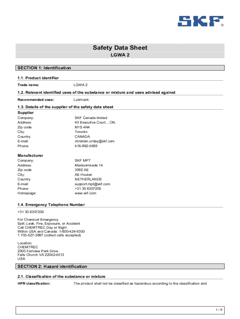 Safety Data Sheet LGA 2 SECTION 1: Identification 1.1. Product identifier Trade name:LGA 21.2. Relevant identified uses of the substance or mixture and uses advised against Recommended uses:Lubricant.1.3.