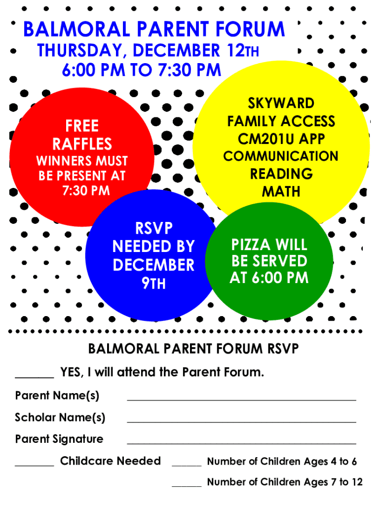 AMORAL PARENT FORUM THURSDAY, DECEMBER 12TH 6:00 PM TO 7:30 SKYWARD FAMILY ACCESS CM201U APPAREL RAFFLESCOMMUNICATIONWINNERS MUST BE PRESENT AT 7:30 READING MATH RSVP NEEDED BY DECEMBER 9THPIZZA WILL