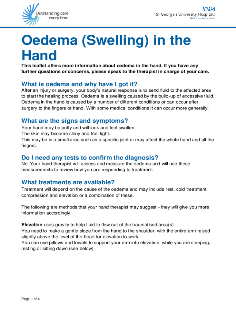 Edema (Swelling) in the Hand This leaflet offers more information about edema in the hand. If you have any further questions or concerns, please speak to the therapist in charge of your care. What