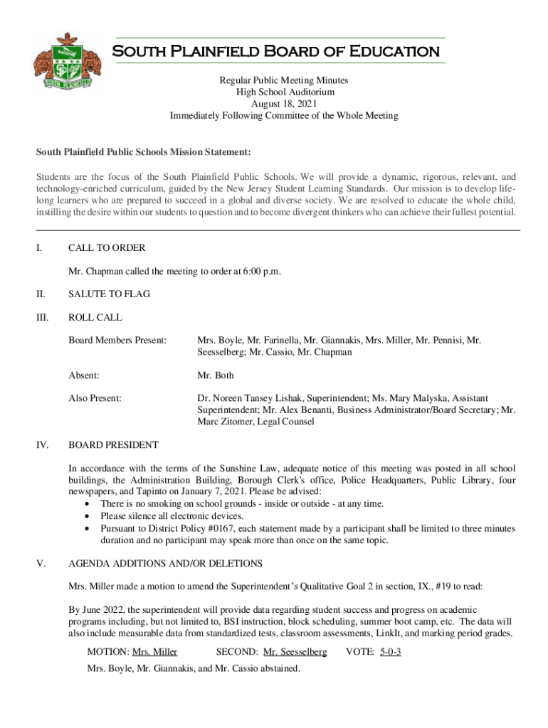 South Plainfield Board of Education Regular Public Meeting Minutes High School Auditorium August 18, 2021, Immediately Following Committee of the Whole Meeting South Plainfield Public Schools Mission