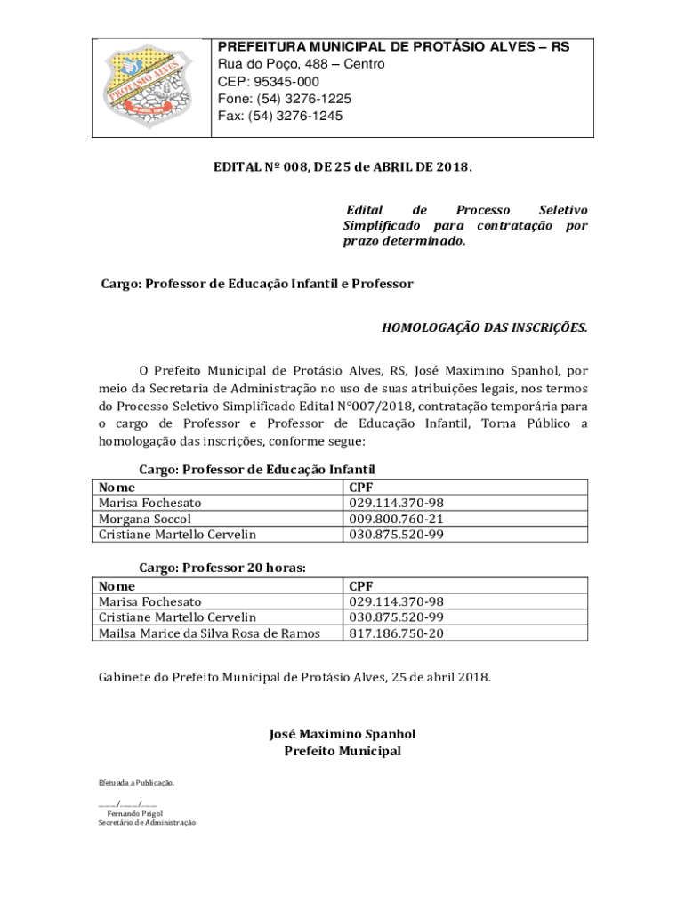 PREFECTURE MUNICIPAL DE PROTEIN ALVES RS RUA do Poo, 488 CENTR CEP: 95345000 One: (54) 32761225 Fax: (54) 32761245EDITAL N 008, DE 25 de APRIL DE 2018. Edital de Processo Selective Simplified para
