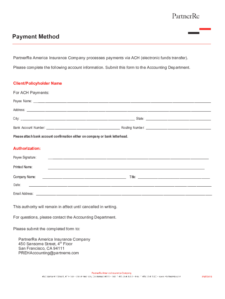 Parterre America Insurance Company processes payments via ACH (electronic funds transfer). Please complete the following account information. Submit this form to the Accounting Department. Client/Policyholder