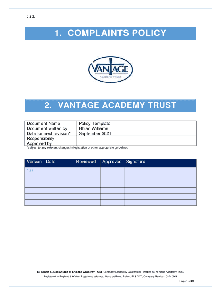 1.1.2.1. COMPLAINTS POLICY2. VANTAGE ACADEMY TRUST Document Name Document written by Date for next revision* Responsibility Approved policy Template Than Williams September 2021×subject to any relevant