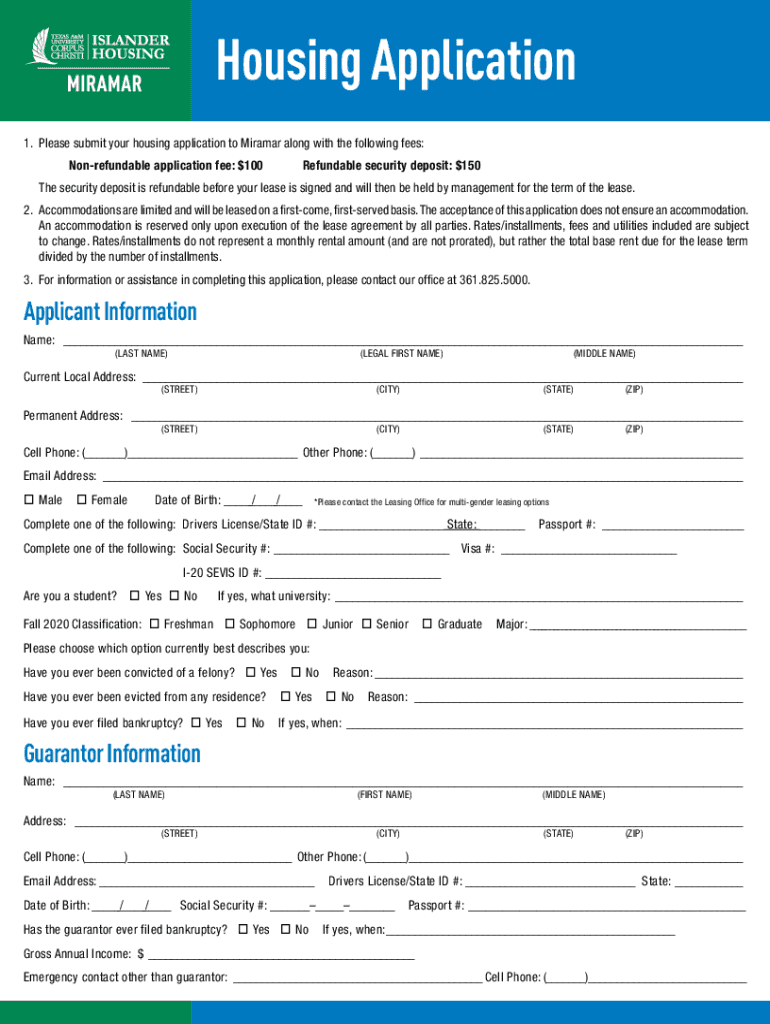 Housing Application 1. Please submit your housing application to Miramar along with the following fees: Nonrefundable application fee: $100Refundable security deposit: $150The security deposit is