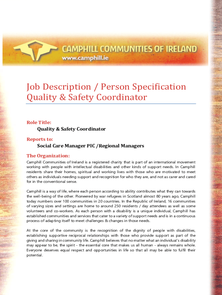 Job Description / Person Specification Quality & Safety Coordinator Role Title: Quality & Safety Coordinator Reports to: Social Care Manager PIC /Regional Managers The Organization: Camphill Communities