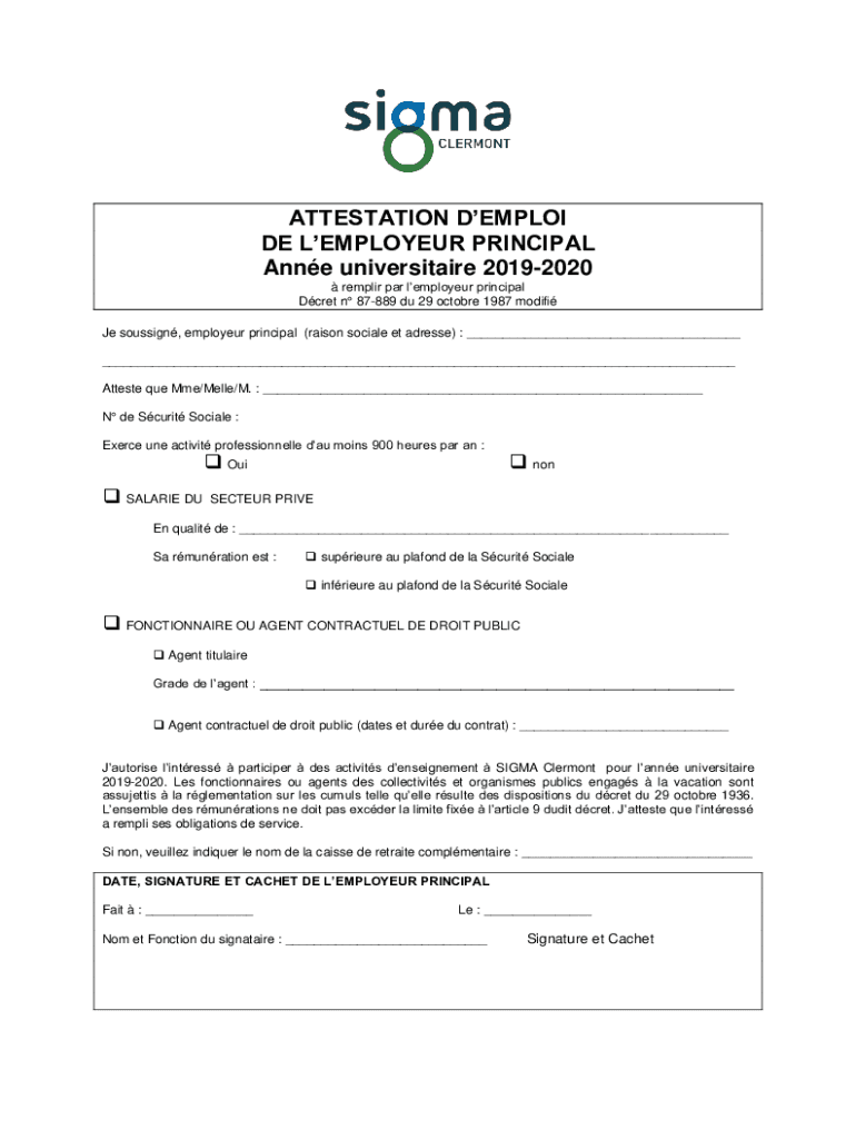 Obtenir le gratuit ATTESTATION D'EMPLOI DE L'EMPLOYEUR PRINCIPAL ...