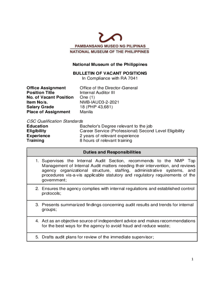 National Museum of the Philippines BULLETIN OF VACANT POSITIONS In Compliance with RA 7041 Office Assignment Position Title No. of Vacant Position Item No/s. Salary Grade Place of AssignmentOffice