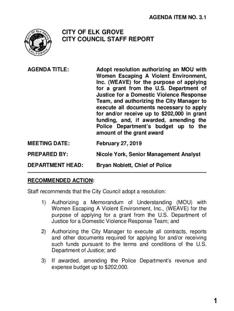 AGENDA ITEM NO. 3.1CITY OF ELK GROVE CITY COUNCIL STAFF REPORTAGE TITLE:Adopt resolution authorizing a with Women Escaping A Violent Environment, Inc. (WEAVE) for the purpose of applying for a grant