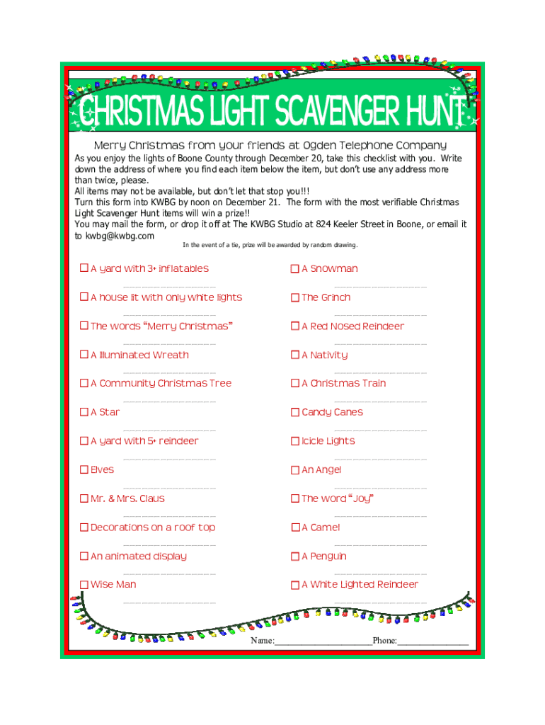 CHRISTMAS LIGHT SCAVENGER HUNT Merry Christmas from your friends at Ogden Telephone Company As you enjoy the lights of Boone County through December 20, take this checklist with you. Write down the
