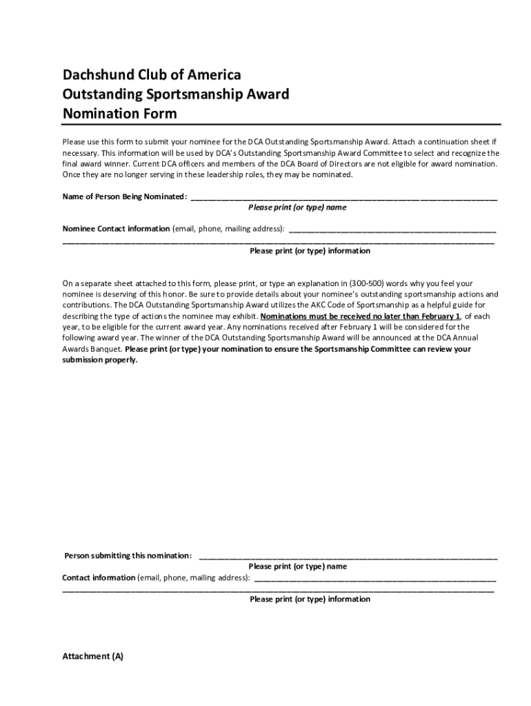 Dachshund Club of America Outstanding Sportsmanship Award Nomination Form Please use this form to submit your nominee for the DCA Outstanding Sportsmanship Award. Attach a continuation sheet if necessary.