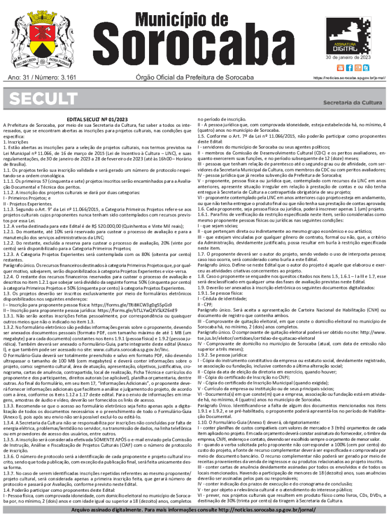 Journal do Munition 3.161Sorocaba, 30 de Janeiro de 2023130 de Janeiro de 2023Ano: 31 / Nero: 3.161EDITAL SEC ULT N 01/2023rgo Official the Prefecture de SorocabaA Prefecture de Sorocaba, POR Mao