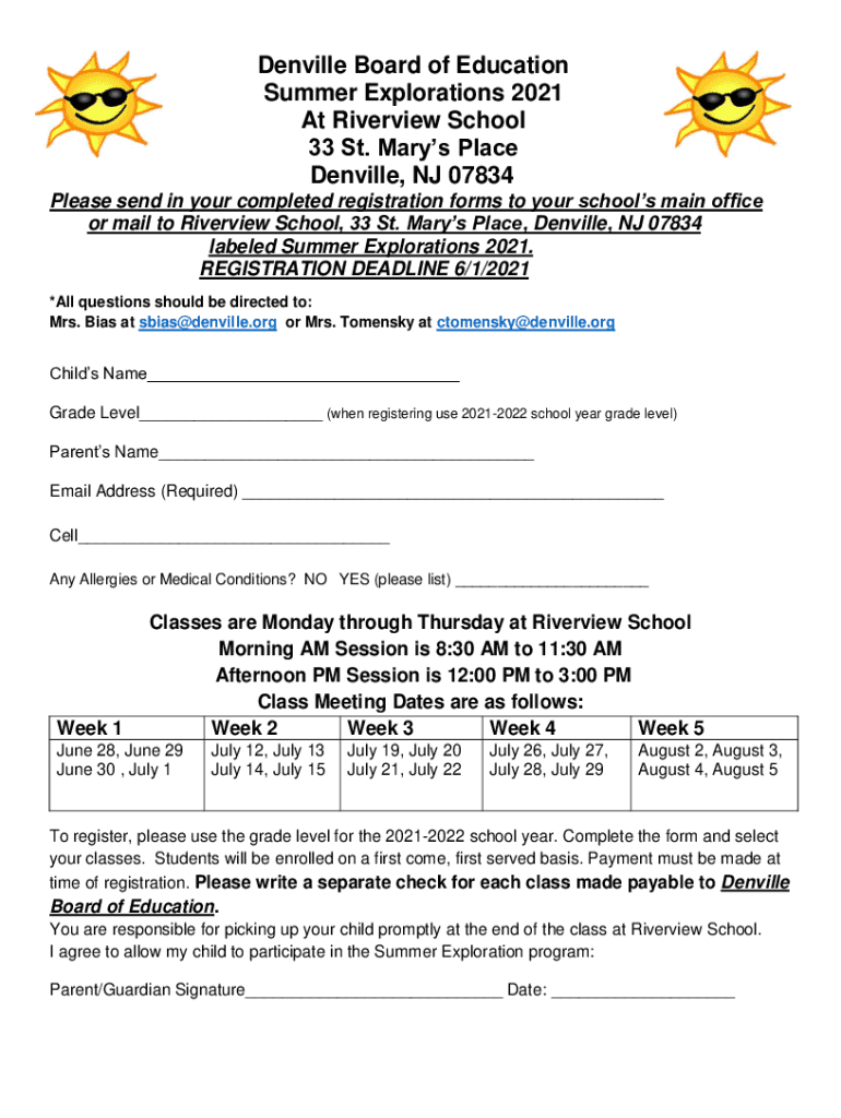 Danville Board of Education Summer Explorations 2021 At Riverview School 33 St. Mary's Place Danville, NJ 07834 Please send in your completed registration forms to your schools main office or mail