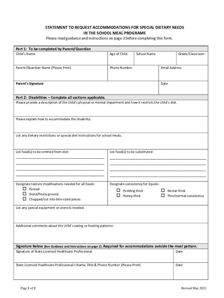 Get the free statement to request accommodations for special dietary ...
