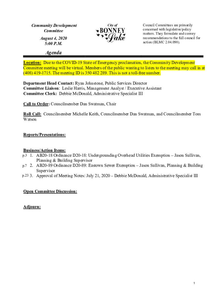 Community Development CommitteeCity of August 4, 2020 5:00 P.M. Council Committees are primarily concerned with legislative/policy matters. They formulate and convey recommendations to the full council