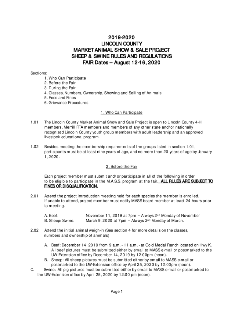 20192020 LINCOLN COUNTY MARKET ANIMAL SHOW & SALE PROJECT SHEEP & SWINE RULES AND REGULATIONS FAIR Dates August 1216, 2020 Sections: 1. Who Can Participate 2. Before the Fair 3. During the Fair 4.
