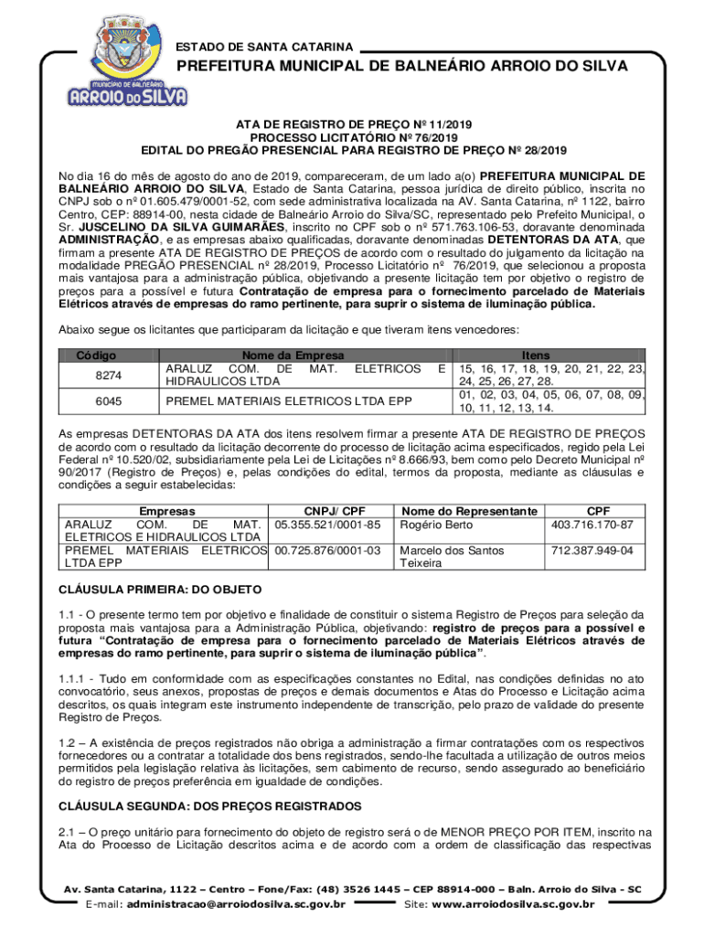 ESTATE DE SANTA CATARINAPREFEITURA MUNICIPAL DE ALBERIO ARROYO DO SILVANA DE REGISTRY DE PRO N 11/2019 PROCESS LIMITATION N 76/2019 EDIT AL DO PRESO PRESENCE PARA REGISTRY DE PRO N 28/2019 Now did