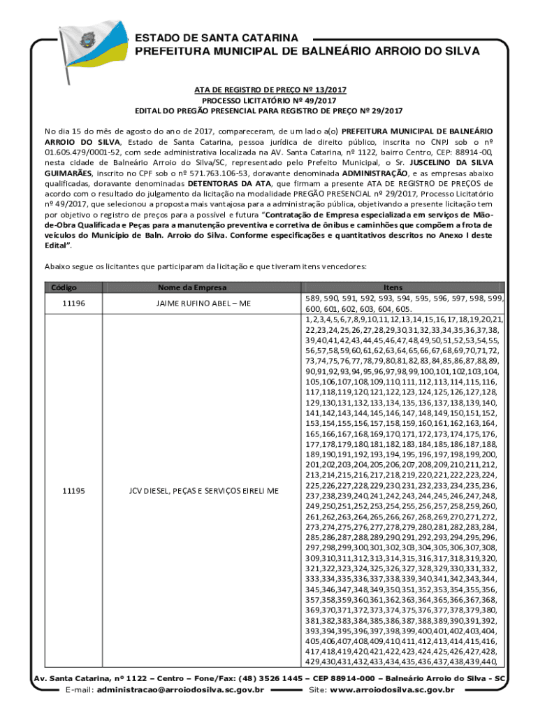 ESTATE DE SANTA CATARINAPREFEITURA MUNICIPAL DE ALBERIO ARROYO DO SILVANA DE REGISTRY DE PRO N 13/2017