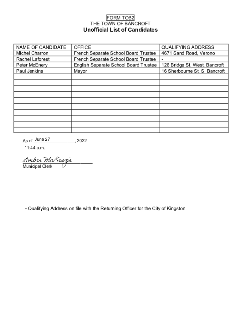 FORM TOB2 THE TOWN OF BANCROFTUnofficial List of Candidates NAME OF CANDIDATE Michel Charon Rachel La forest Peter Scenery Paul JenkinsOFFICE French Separate School Board Trustee French Separate School