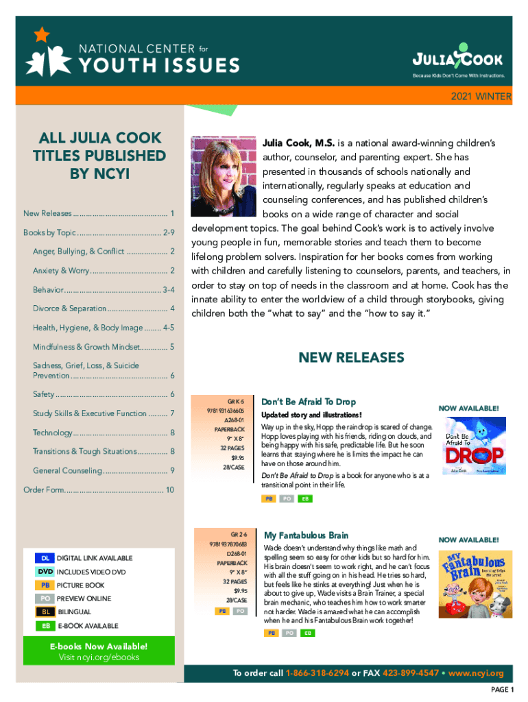 2021 WINTER ALL JULIA COOK TITLES PUBLISHED BY NCY New Releases............................................. 1 Books by Topic........................................ 29Anger, Bullying, & Conflict
