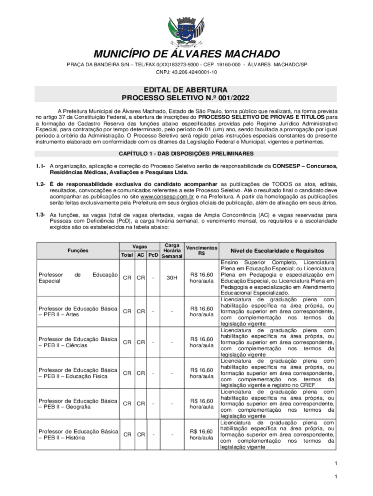 MUNICIPAL DE LVA RES MACHADO PRAY DA MADEIRA S/N TEL/FAX 0(XX)1832739300 CEP 19160000 LVA RES MACHADO/SP CNJ: 43.206.424/000110EDITAL DE APERTURE PROCESS SELECTIVE N. 001/2022 A Prefecture Municipal