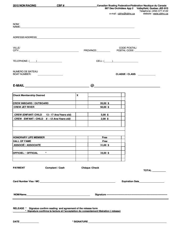 2015 NON-RACING CBF # Canadian Boating Federation/F d ration Antique du Canada