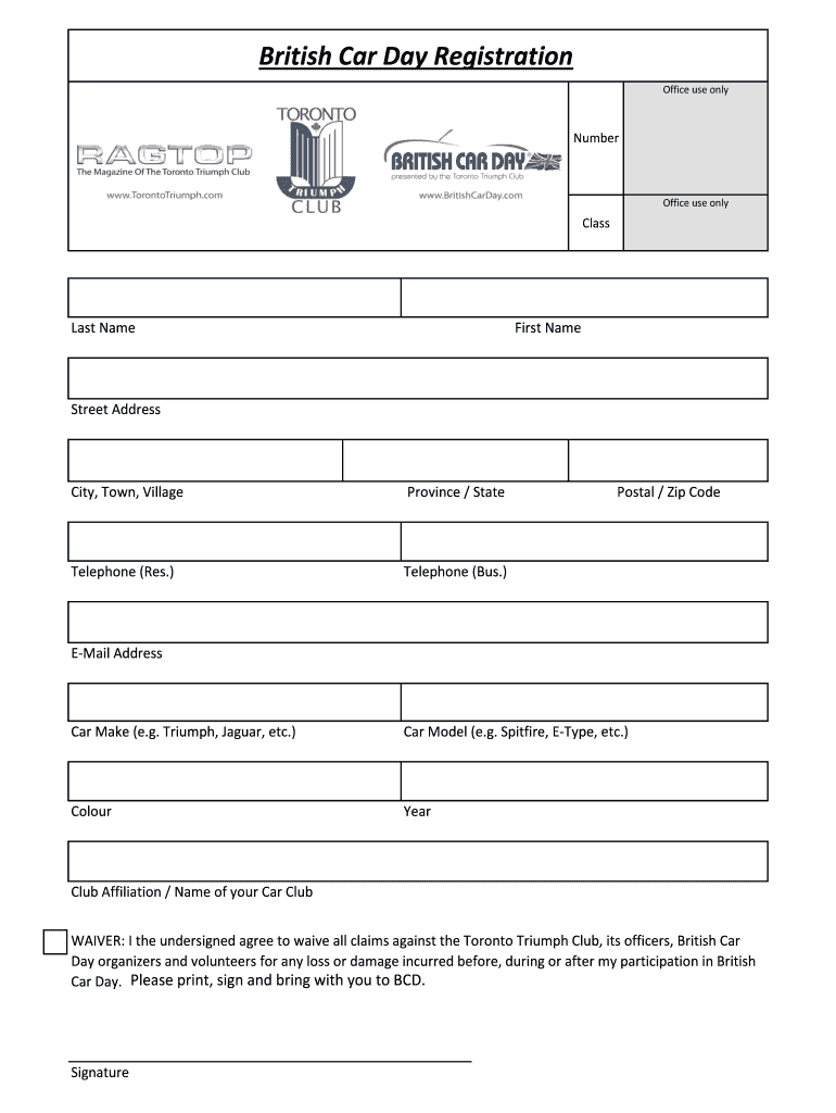 British Car Day Registration Office use only Number Office use only Class Last Name First Name Street Address City, Town, Village Province / State Telephone (Res.) Telephone (Bus.) Postal / Zip Code