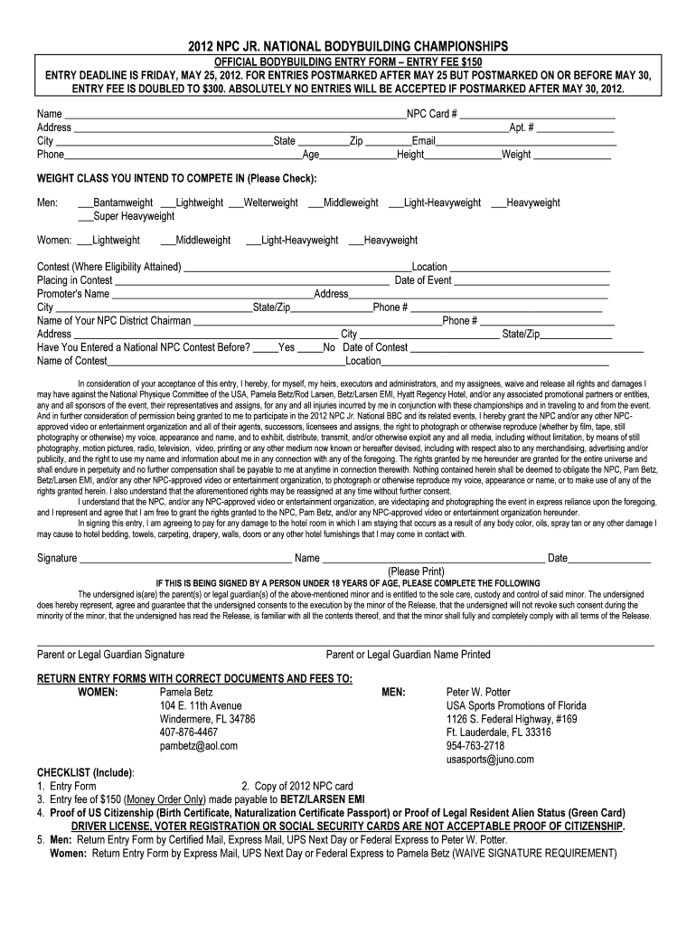 2012 NPC JR. NATIONAL BODYBUILDING CHAMPIONSHIPS OFFICIAL BODYBUILDING ENTRY FORM ENTRY FEE $150 ENTRY DEADLINE IS FRIDAY, MAY 25, 2012. FOR ENTRIES POSTMARKED AFTER MAY 25 BUT POSTMARKED ON OR BEFORE