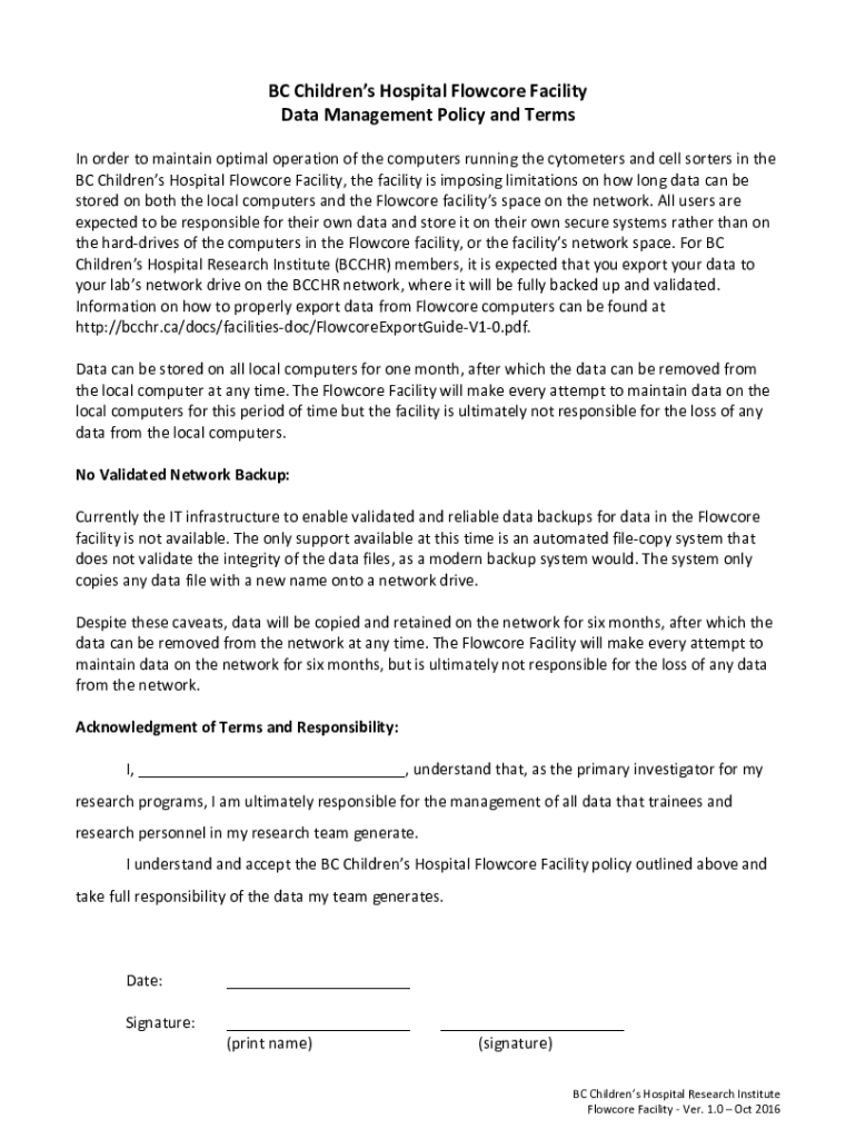 BC Children's Hospital Flow core Facility Data Management Policy and Terms In order to maintain optimal operation of the computers running the cyclometers and cell sorters in the BC Children's Hospital