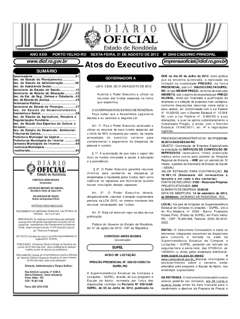 ANO XXIXPORTO VELHOROwww. Dion.RO.gov.brSEXTAFEIRA, 31 DE AGO STO DE 2012 N 2049 SALERNO Principality do Executivoimprensaoficial@diof.ro.gov.brGOVERNADORIADOE now did 05 de Julio de 2012,