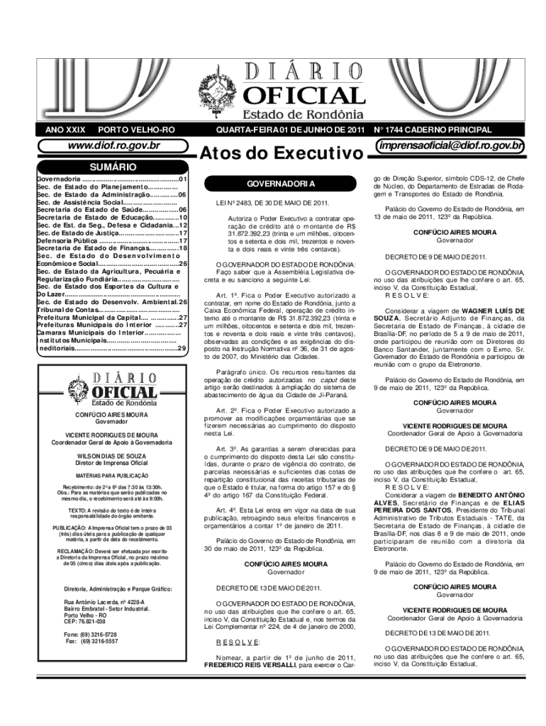 ANO XXIXPORTO VELHOROwww. Dion.RO.gov.brQUARTAFEIRA 01 DE JUNO DE 2011 N 1744 SALERNO Principality do Executivoimprensaoficial@diof.ro.gov.brGOVERNADORIAgo de Direo Superior, solo CDS12,