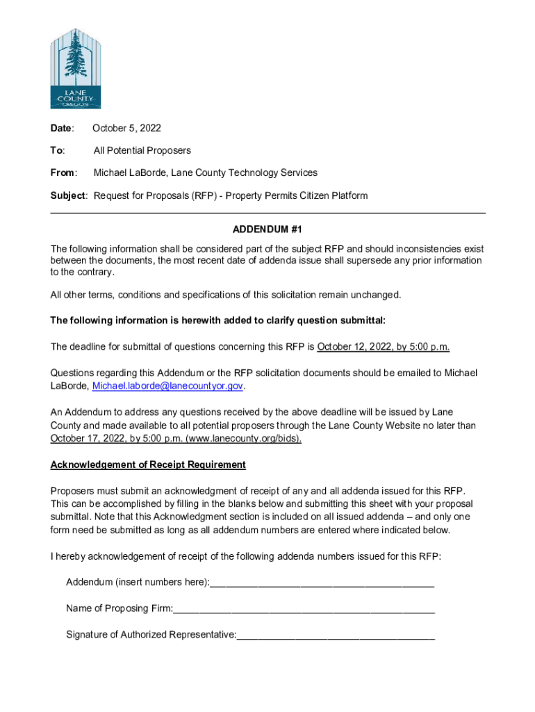 Date:October 5, 2022To:All Potential ProposersFrom:Michael Labored, Lane County Technology ServicesSubject: Request for Proposals (RFP) Property Permits Citizen Platform ADDENDUM #1 The following