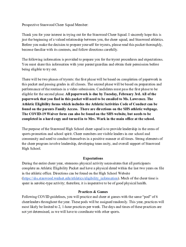 Prospective Stan wood Cheer Squad Member: Thank you for your interest in trying out for the Stan wood Cheer Squad. I sincerely hope this is just the beginning of a valued relationship between you,
