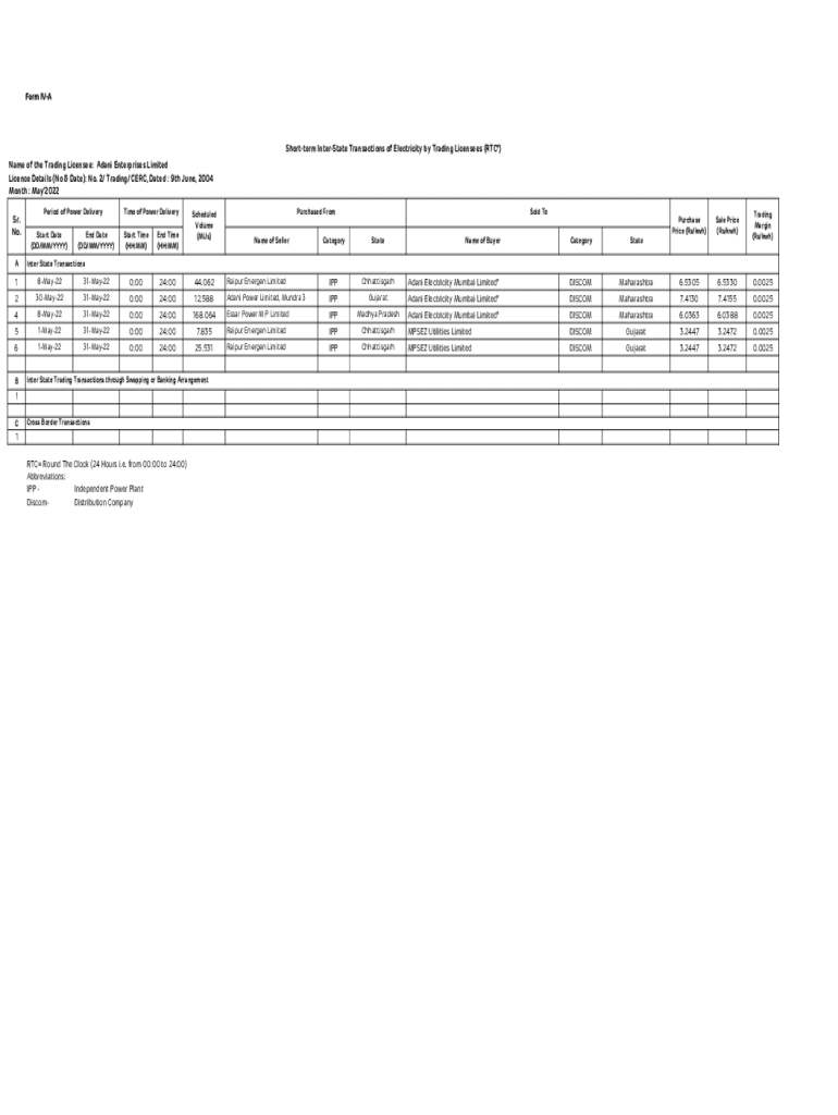Form IVAShortterm Interstate Transactions of Electricity by Trading Licensees (RTC*) Name of the Trading Licensee: Adana Enterprises Limited License Details (Now & Date): No. 2/ Trading/ CERN, Dated