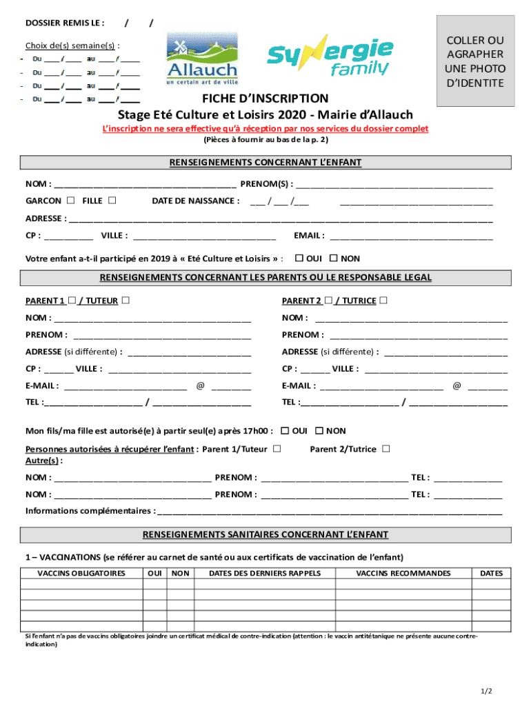 Obtenir le gratuit FICHE D'INSCRIPTION Stage Et Culture et Loisirs 2020