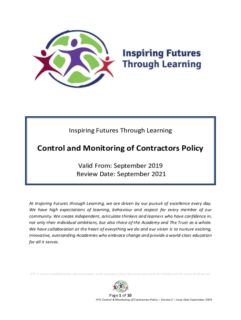 Inspiring Futures Through LearningControl and Monitoring of Contractors Policy Valid From: September 2019 Review Date: September 2021At Inspiring Futures through Learning, we are driven by our pursuit