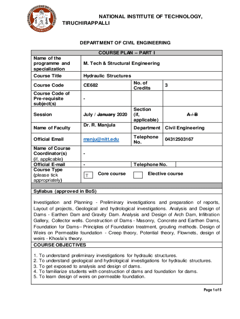 NATIONAL INSTITUTE OF TECHNOLOGY, TIRUCHIRAPPALLIDEPARTMENT OF CIVIL ENGINEERING COURSE PLAN PART I Name of the program and specialization. Tech & Structural EngineeringCourse TitleHydraulic StructuresCourse