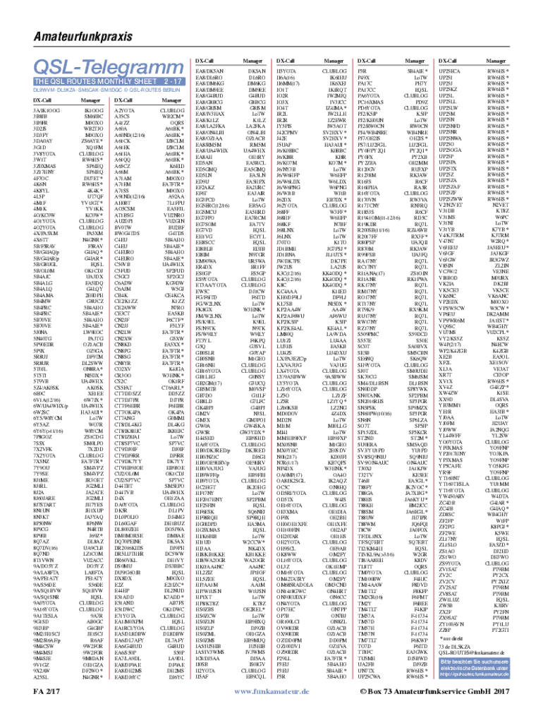 AmateurfunkpraxisQSLTelegramm THE SL ROUTES MONTHLY SHEET 2 17 DL9WVM DL5KZA SM5CAKSM5DQC ROUTES BERLINDXCall 3A/IK1OOG 3B8JB 3B9FR 3D2JS 3D3FY 3DA0AY 3G1D 3V8YOTA 3W1T 3Z0XMAS 3Z17HNY 4F7OC 4K6N