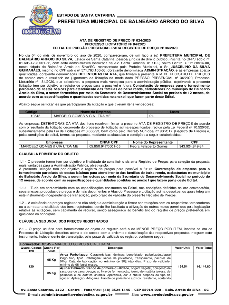 ESTATE DE SANTA CATARINAPREFEITURA MUNICIPAL DE ALBERIO ARROYO DO SILVANA DE REGISTRY DE PRO N 024/2020 PROCESS LIMITATION N 84/2020 EDIT AL DO PRESO PRESENCE PARA REGISTRY DE PRO N 36/2020 Now did