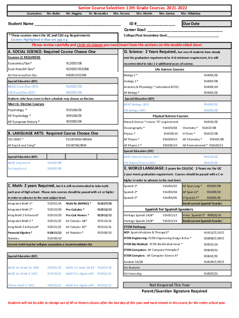 Senior Course Selection: 12th Grade Courses 20212022 Counselors:Ms. Babier. Higgins. Hernandez Mrs. Ferragamo. Martin Mrs. Santos Mrs. VillalobosStudent Name ___ID #___ Due Date Career Goal: ___*