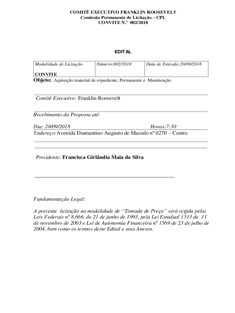 Modalidade de LicitaoNmero:002/2018Data de Emission:20/09/2018CONVITE
