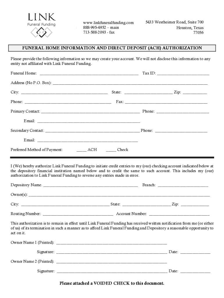 WWW.linkfuneralfunding.com 8889954952 main 7135882093 fax5433 Westerner Road, Suite 700 Houston, Texas 77056FUNERAL HOME INFORMATION AND DIRECT DEPOSIT (ACH) AUTHORIZATION Please provide the following