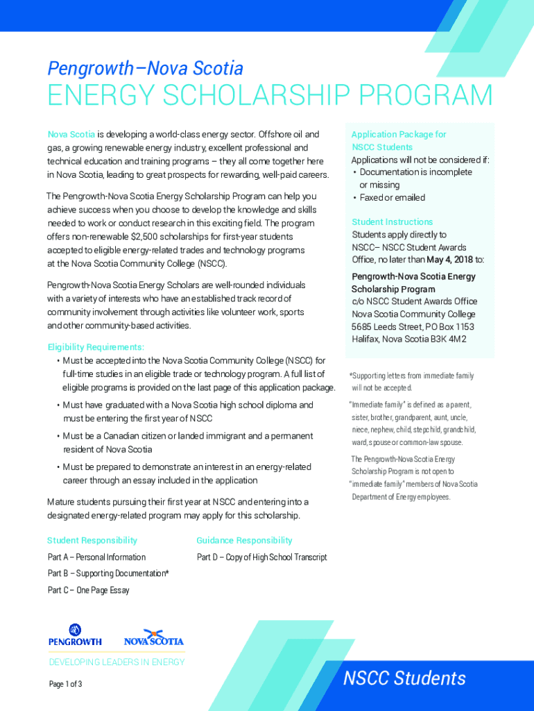 PengrowthNova ScotiaENERGY SCHOLARSHIP PROGRAM Nova Scotia is developing a world-class energy sector. Offshore oil and gas, a growing renewable energy industry, excellent professional and technical