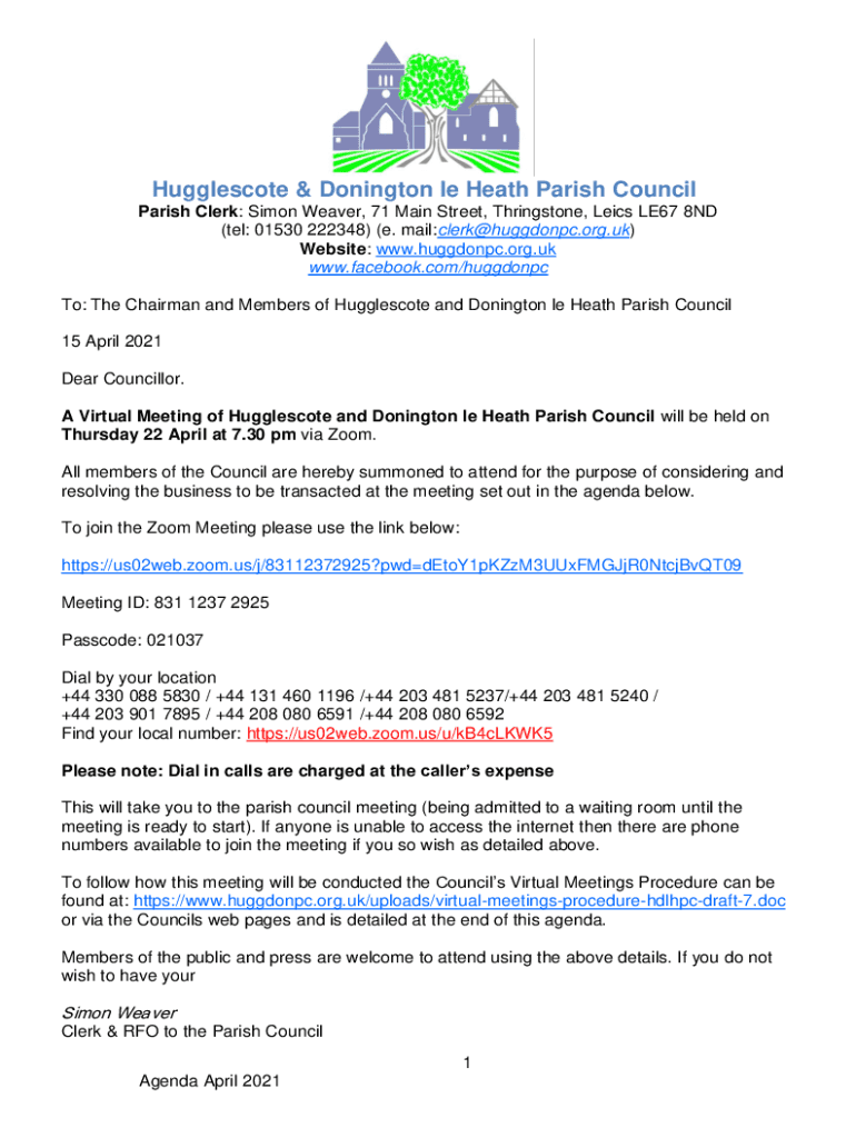 Hugglescote & Covington LE Heath Parish Council Parish Clerk: Simon Weaver, 71 Main Street, Livingstone, Lack LE67 8ND (tel: 01530 222348) (e. mail:clerk@huggdonpc.org.UK) Website: www.huggdonpc.org.uk