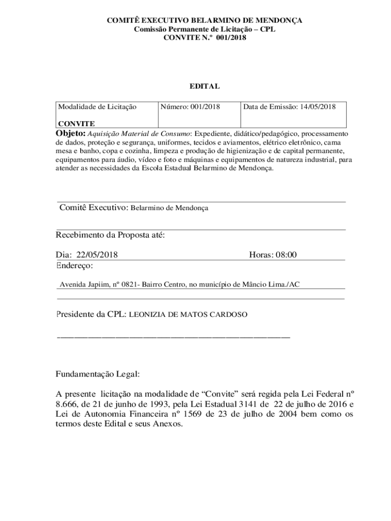 Modalidade de LicitaoNmero: 001/2018Data de Emission: 14/05/2018CONVITE