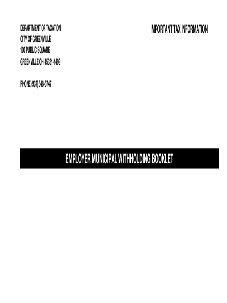DEPARTMENT OF TAXATION CITY OF GREENVILLE 100 PUBLIC SQUARE GREENVILLE OH 453311499IMPORTANT TAX INFORMATIONPHONE (937) 5485747EMPLOYER MUNICIPAL WITHHOLDING BOOKLETINSTRUCTIONS FOR PREPARING AND