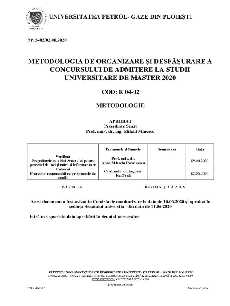 UNIVERSITIES PETROL GAZE DIN Pointing. 5402/02.06.2020METODOLOGIA DE ORGANIZE I DESPERATE A CONCURSULUI DE ADMIRE LA STUDIO UNIVERSITY DE MASTER 2020 COD: R 0402 METHODOLOGIES ACROBAT Breeding Sent
