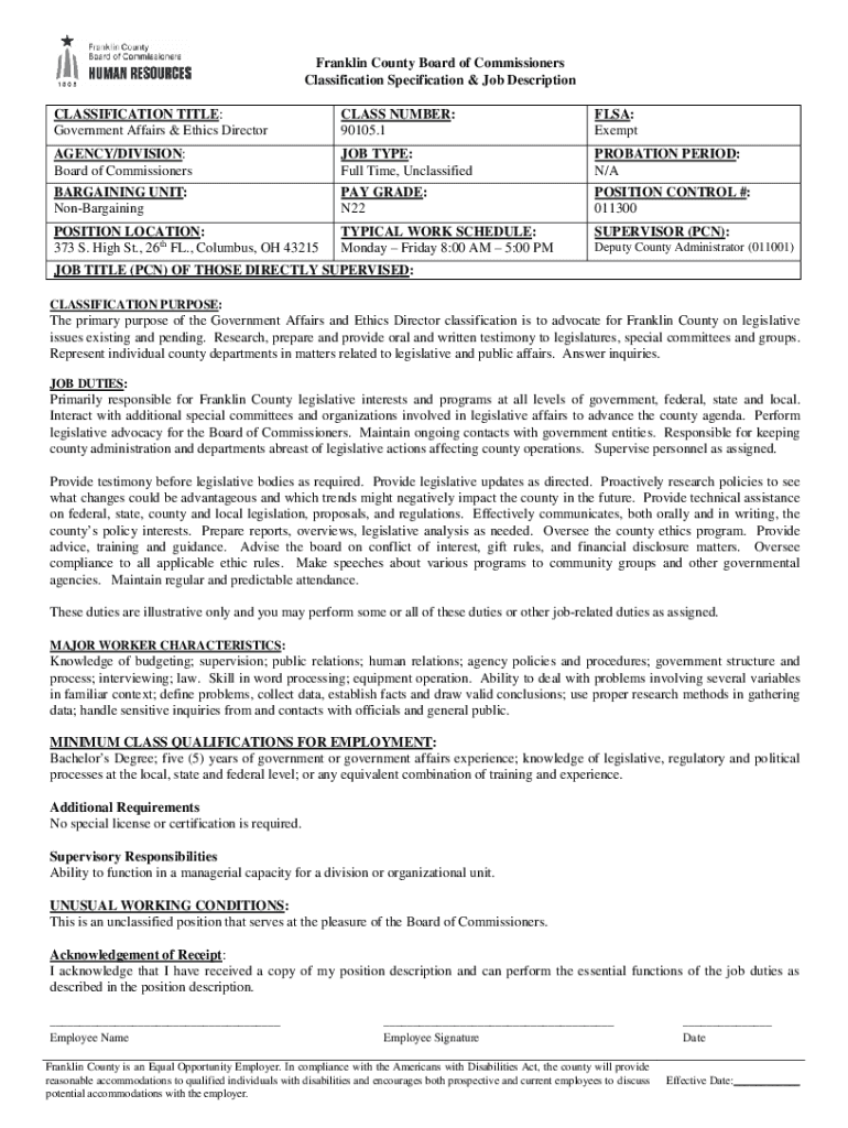 Franklin County Board of Commissioners Classification Specification & Job Description CLASSIFICATION TITLE: Government Affairs & Ethics DirectorCLASS NUMBER: 90105.1FLSA: ExemptAGENCY/DIVISION: Board