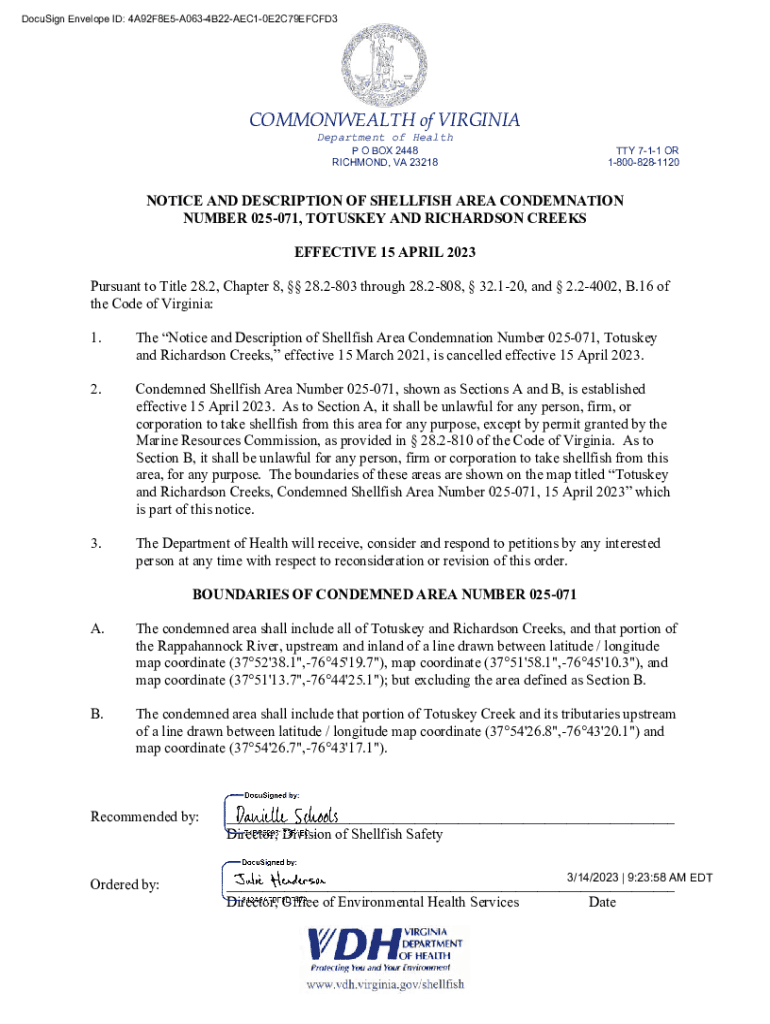 DocuSign Envelope ID: 4A92F8E5A0634B22AEC10E2C79EFCFD3COMMONWEALTH of VIRGINIA Department of Health P O BOX 2448 RICHMOND, VA 23218TTY 711 OR 18008281120NOTICE AND DESCRIPTION OF SHELLFISH AREA CONDEMNATION