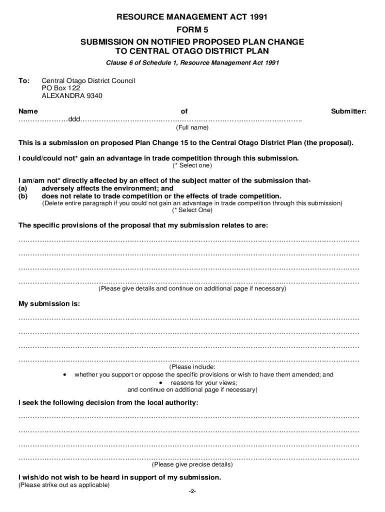 RESOURCE MANAGEMENT ACT 1991 FORM 5 SUBMISSION ON NOTIFIED PROPOSED PLAN CHANGE TO CENTRAL OT AGO DISTRICT PLAN Clause 6 of Schedule 1, Resource Management Act 1991To:Central Stage District Council