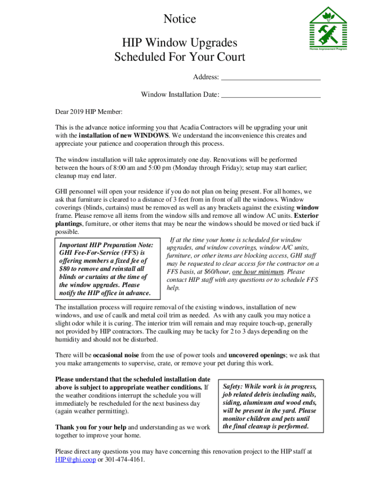 Notice HIP Window Upgrades Scheduled For Your Court Address: ___ Window Installation Date: ___ Dear 2019 HIP Member: This is the advance notice informing you that Acadia Contractors will be upgrading